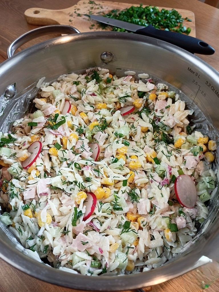 Szybka w przygotowaniu, w zasadzie zanim ugotuje się makaron, mamy już przygotowane resztę składników. Wystarczy wymieszać i można zajadać. Nam ta sałatka bardzo smakuje 😊.