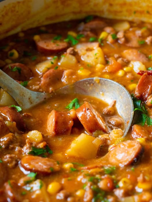 Będziesz chciał gotować to przez około godzinę, aby naprawdę uzyskać idealną głębię smaku. To bogate, słone, mięsne, wędzone gulasz, ale cała ta sytość jest równoważona przez słodycz kukurydzy, pomidorów i delikatnych ziemniaków. To sycące danie – super sycące i super pyszne.