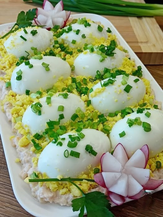 W międzyczasie jajka gotujemy na twardo, obieramy ze skorupki i przekrawamy na pół. Jedno z żółtek wyjmujemy i rozdrabniamy widelcem.