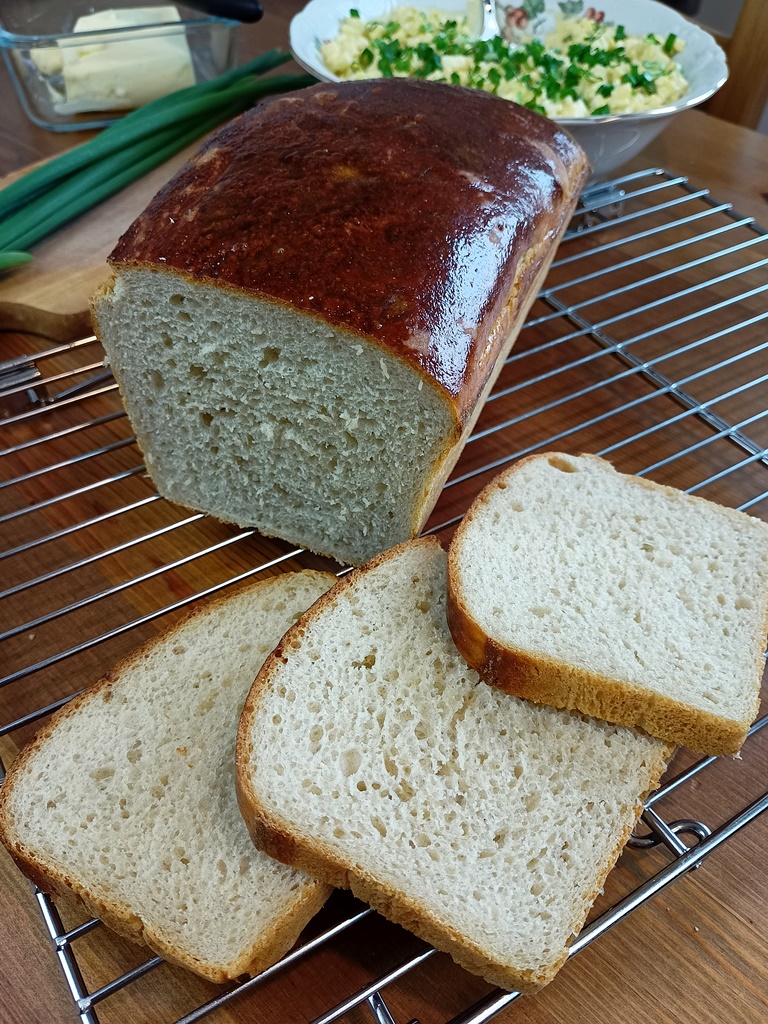 Ten chleb zawsze wychodzi, jest prosty w przygotowaniu i pyszny. Chleb z tego przepisu przetestowałam wielokrotnie i bardzo nam smakuje. Co ważne – nie kruszy się i długo zachowuje świeżość. Polecam – u nas gości często😋. W kuchni pomaga 6-letnia Ania – uwielbiamy wspólnie kucharzyć😊😉. Składniki (na 2 bochenki chleba):
