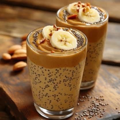 Składniki (na 2 porcje): 2 dojrzałe banany 2 łyżki masła orzechowego (bez cukru i oleju palmowego) 250 ml mleka (może być roślinne: kokosowe, migdałowe, owsiane) 3 łyżki nasion chia 1 łyżka miodu lub syropu klonowego 1/2 łyżeczki ekstraktu waniliowego (opcjonalnie) Kilka orzechów do posypania (np. migdały, orzechy włoskie, laskowe) Sposób przygotowania: