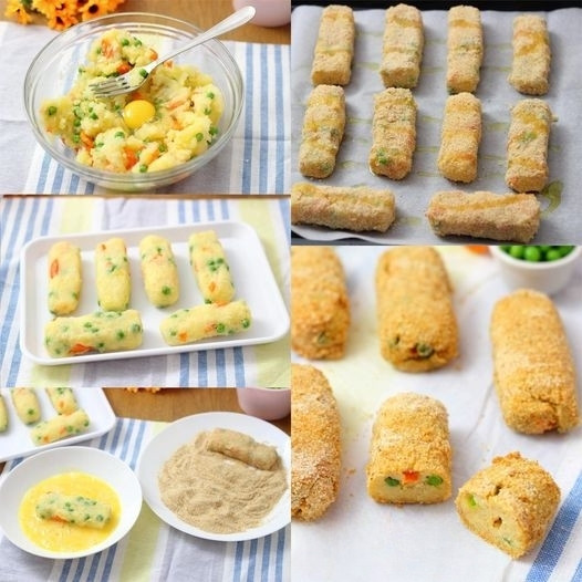 Paluszki warzywne – prosty przepisSkładniki: 4 ziemniaki (ugotowane) 1 jajko 1 marchewka (ugotowana) 1/2 szklanki groszku (ugotowanego) Sól i pieprz do smaku Bułka tarta do obtaczania Dodatkowe jajko do panierowania Olej do pieczenia lub smażenia Następny→