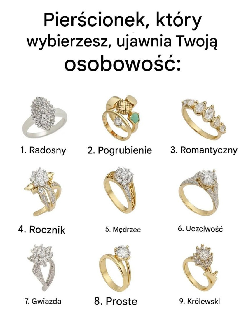 Czy zauważyłeś kiedyś, że niektóre pierścionki zdają się do Ciebie „wołać”, jakby znały już Twoje najgłębsze sekrety? A co, jeśli to nie tylko zbieg okoliczności? Każdy pierścionek opowiada historię – historię Twojego serca, Twojej energii i Twojego sposobu kochania. Który z tych dziewięciu mógłby być Twój?