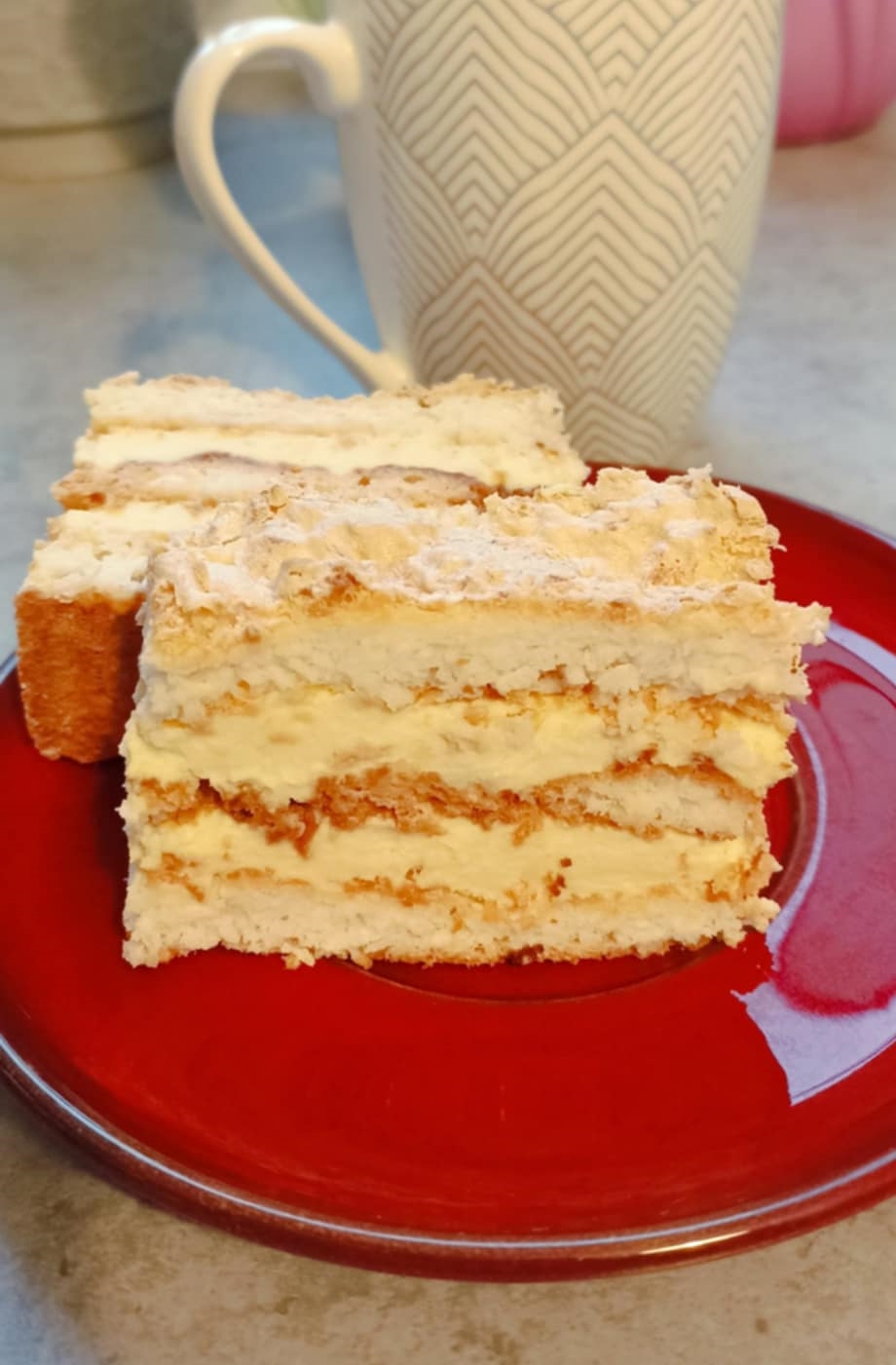 To ciasto to taka odwrócona wersja rafaello. Kokosowe blaty, przełożone aksamitnym kremem budyniowym tworzą naprawdę pyszny i efektowny deser. Całość jest lekka i dość słodka, aromatyczne i chrupiące wiórki w bezie doskonale komponują się z kremowym budyniem stanowiąc deser, któremu nie sposób się oprzeć.